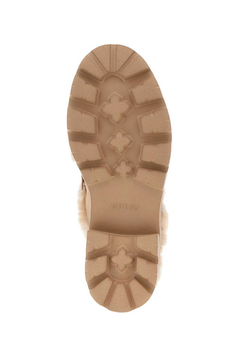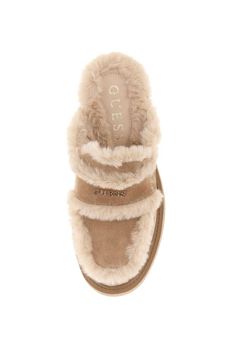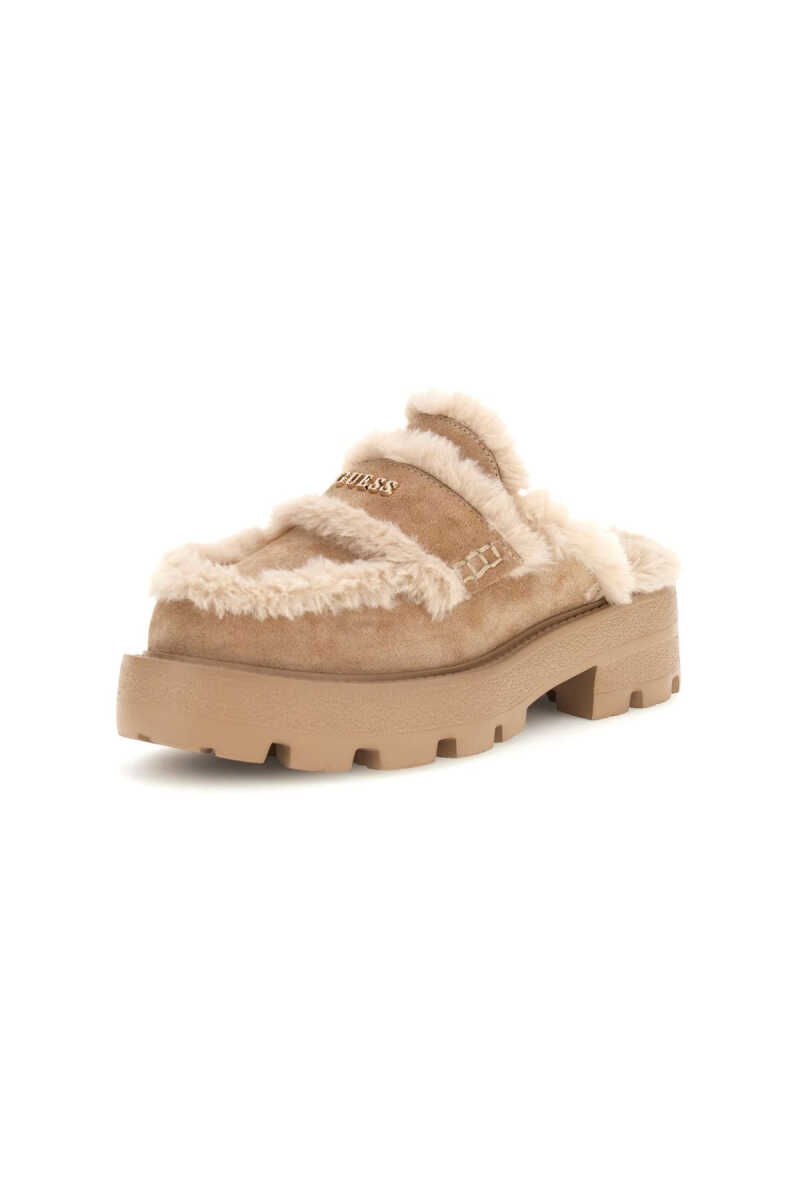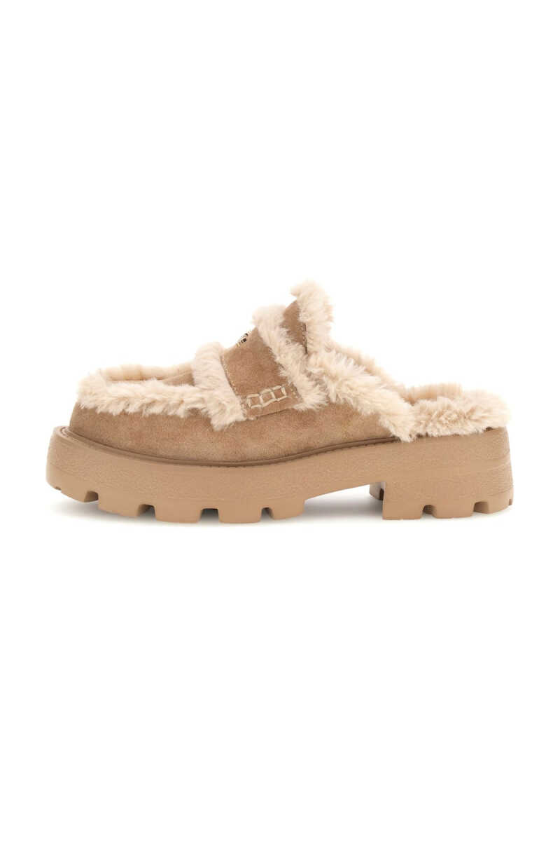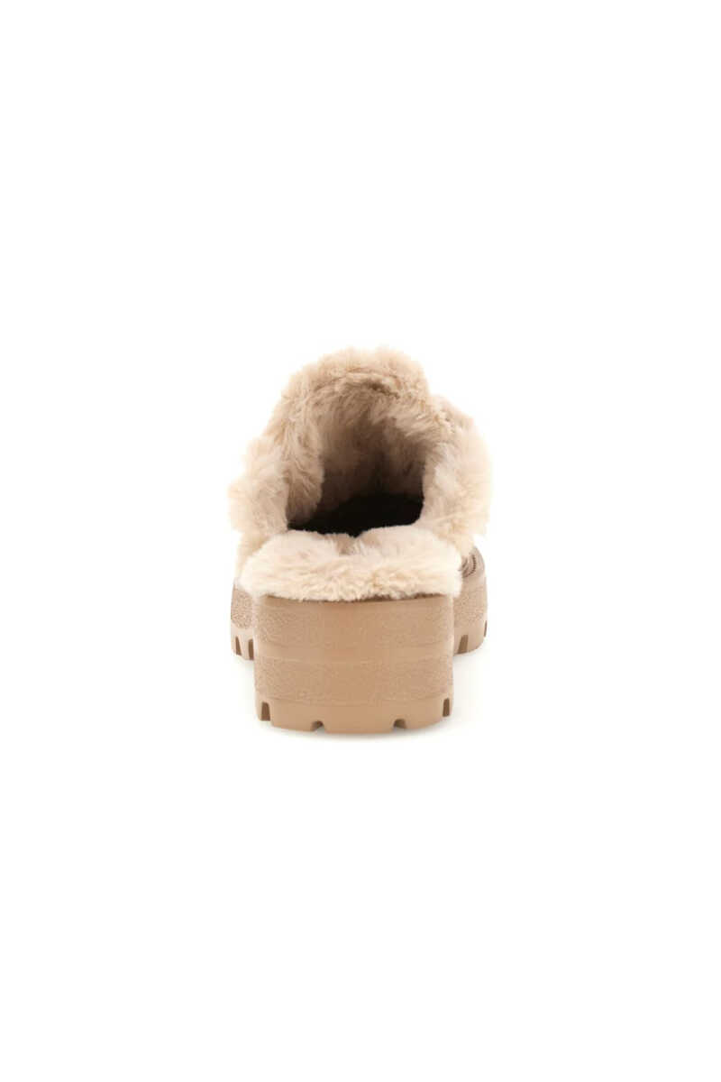 Konforu ve trendleri bir araya getiren bu sabo terlik, soğuk havaların en şık tamamlayıcısı olmaya aday. Bej süet yüzeyi, dikişler boyunca uzanan ve içini tamamen kaplayan pelüş kürk astarla zenginleştirilmiştir. Bu sıcak ve yumuşak yapı, ayağı gün boyu rahat ettirir. Modelin kalın ve tırtıklı traktör tabanı, hem tasarıma modern ve güçlü bir karakter katar hem de sağlam bir zemin tutuşu sunar. Üst bandındaki metal yazı detayı ise zarif bir son dokunuştur.