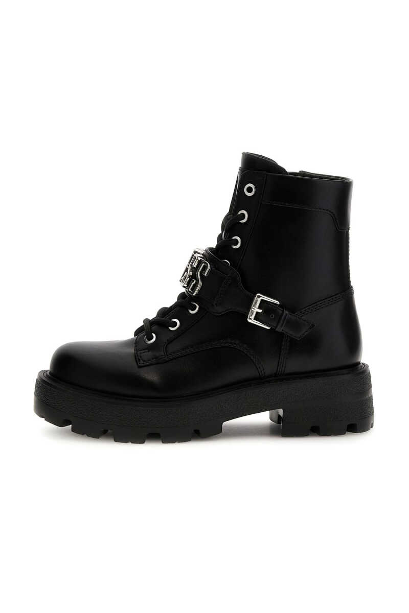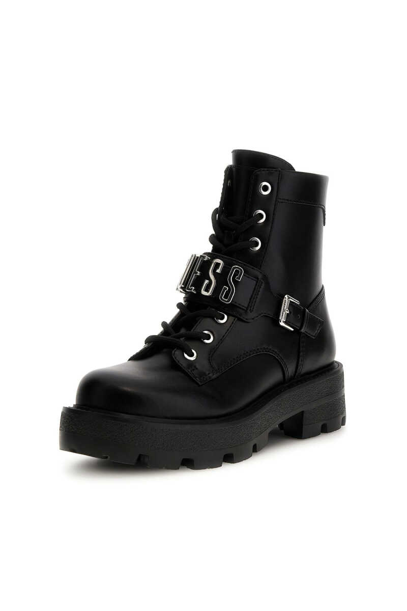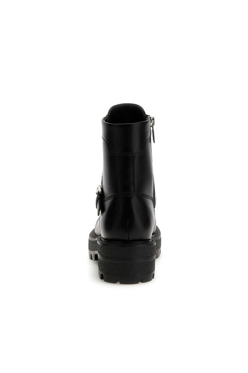 Klasik postal stiline modern ve asi bir yorum getiren bu bot, iddialı duruşuyla öne çıkar. Pürüzsüz siyah suni deri yüzeyi, bağcıkların üzerinden geçen ve büyük bir metal yazı detayı taşıyan toka bantlı aksesuarla tamamlanır. Modelin kalın ve tırtıklı traktör tabanı, hem tasarıma güçlü bir karakter katar hem de üstün zemin tutuşu sunar. İç kısmındaki fermuar detayı ise bağcıklarla uğraşmadan pratik bir giyim kolaylığı sağlar.