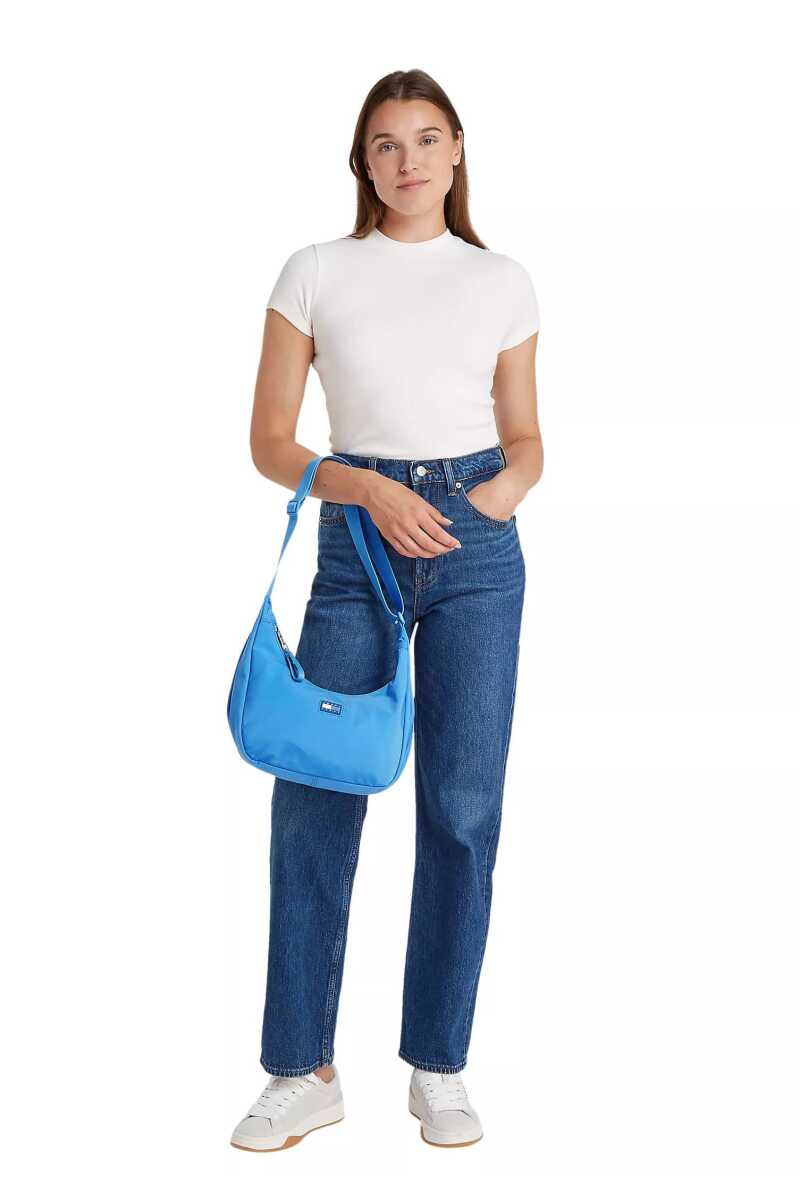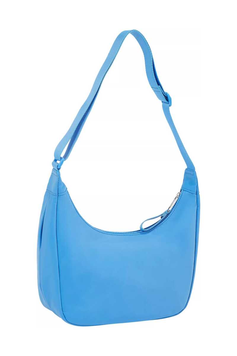 90'lar ve 2000'ler modasından ilham alan yarım ay formundaki bu çanta, stilinize enerjik ve modern bir dokunuş katıyor. Canlı mavi rengiyle dikkat çekerken, hafif ve dayanıklı polyester malzemesi sayesinde konforlu bir kullanım sunar. Ayarlanabilir askısı sayesinde hem omuzda hem de çapraz olarak kullanılabilen bu fonksiyonel parça, fermuarlı ana bölmesiyle eşyalarınızı güvende tutar. Ön yüzündeki logo patch'i, tasarımın modern kimliğini vurgular.