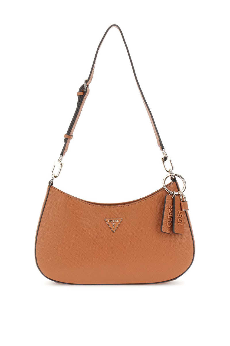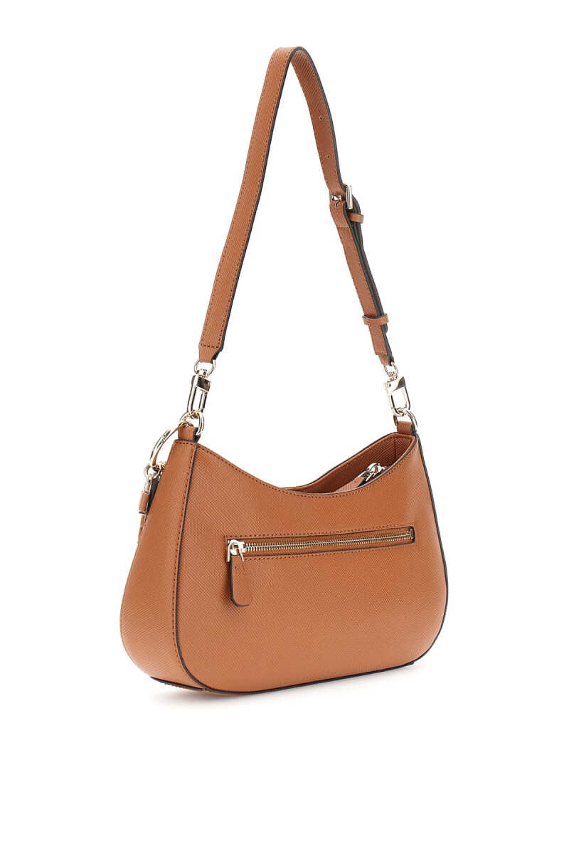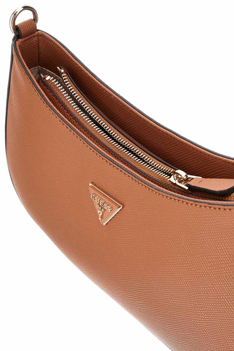 Modern ve minimalist bir tasarıma sahip bu omuz çantası, popüler yarım ay "hobo" formuyla öne çıkar. Dokulu taba rengi poliüretan yüzeyi ve akıcı silüeti, çantaya zarif bir görünüm kazandırır. Ön yüzeydeki üçgen formlu metal aksesuar ve çıkarılabilir etiket charm'ı, çantanın şık tasarımını tamamlar. Ayarlanabilir omuz askısı kişiselleştirilmiş bir konfor sunarken, arka kısmındaki fermuarlı cep pratik bir kullanım sağlar.