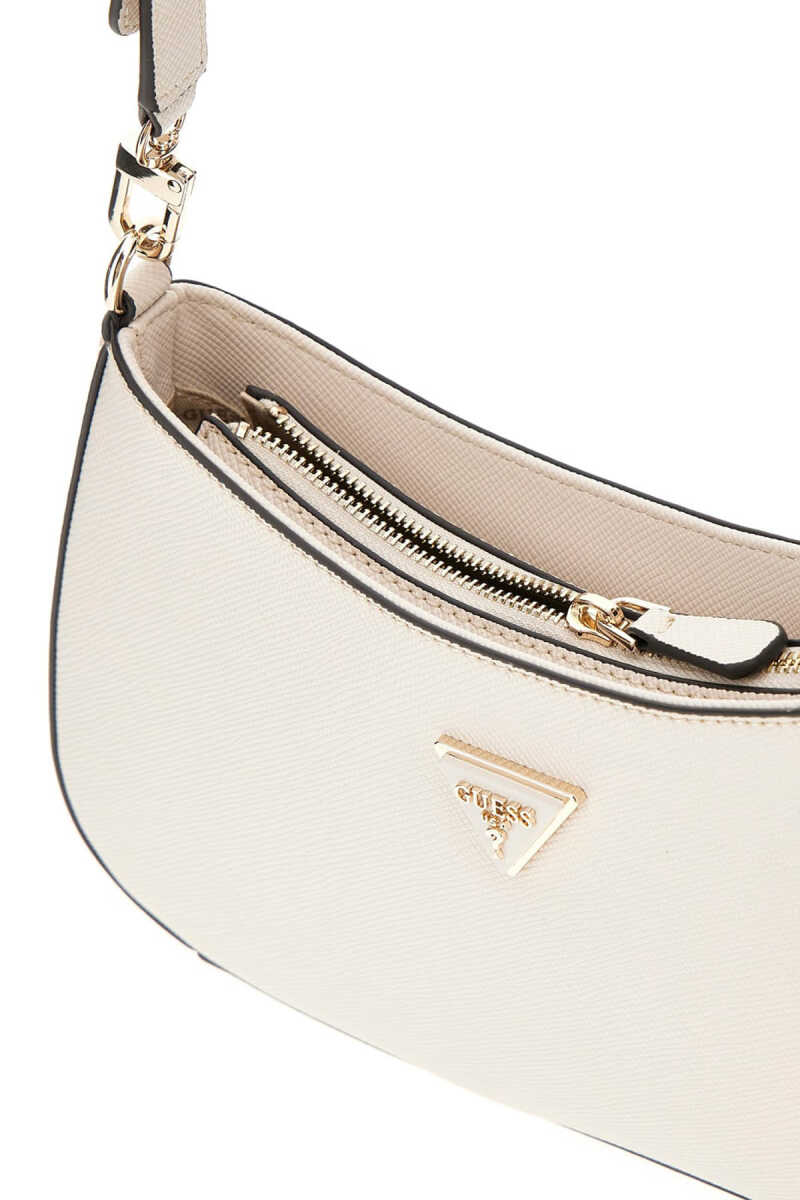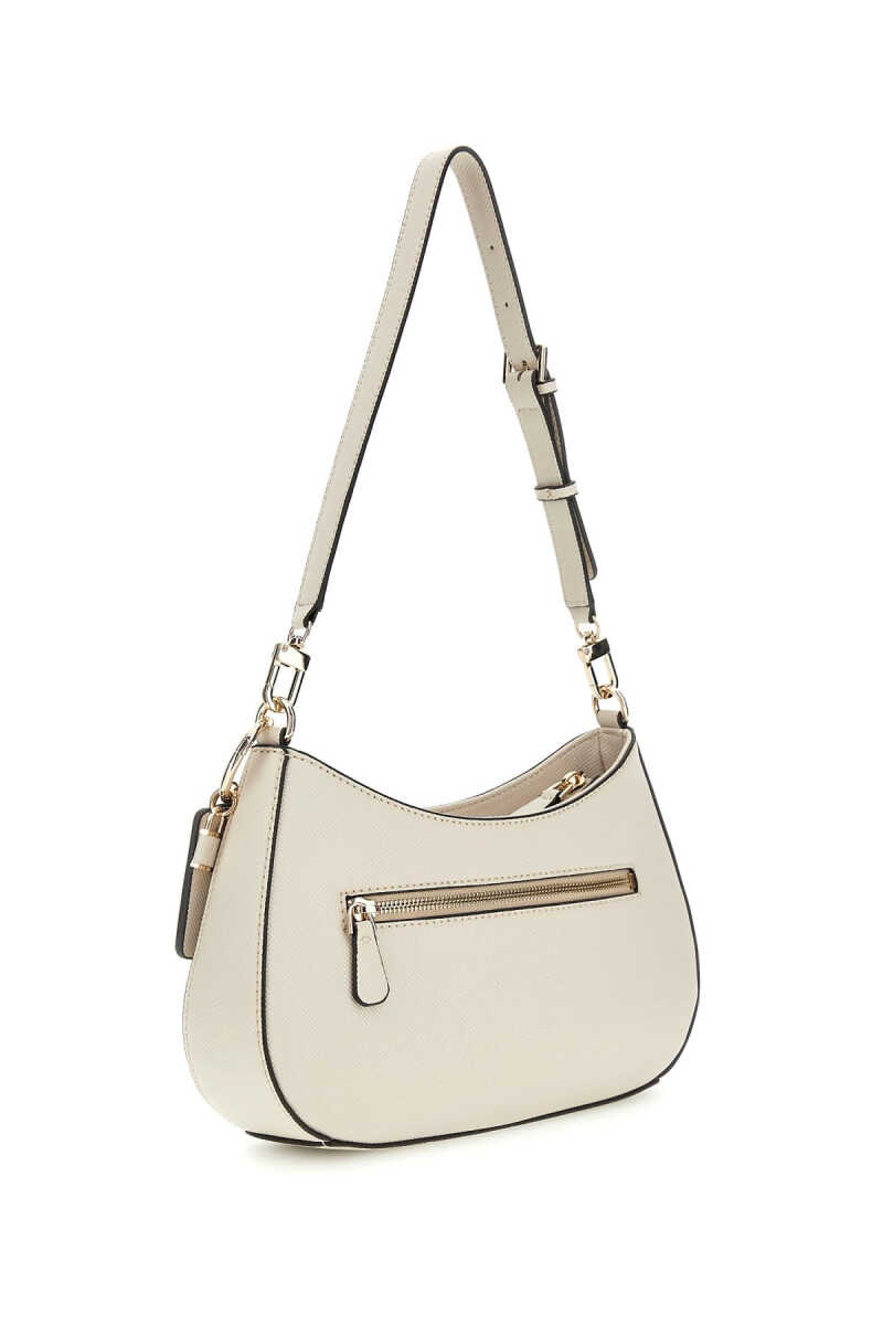 Modern ve minimalist bir tasarıma sahip bu omuz çantası, popüler yarım ay "hobo" formuyla öne çıkar. Dokulu kırık beyaz poliüretan yüzeyi ve akıcı silüeti, çantaya zarif bir görünüm kazandırır. Ön yüzeydeki üçgen formlu metal aksesuar ve çıkarılabilir etiket charm'ı, çantanın şık tasarımını tamamlar. Ayarlanabilir omuz askısı kişiselleştirilmiş bir konfor sunarken, arka kısmındaki fermuarlı cep pratik bir kullanım sağlar.