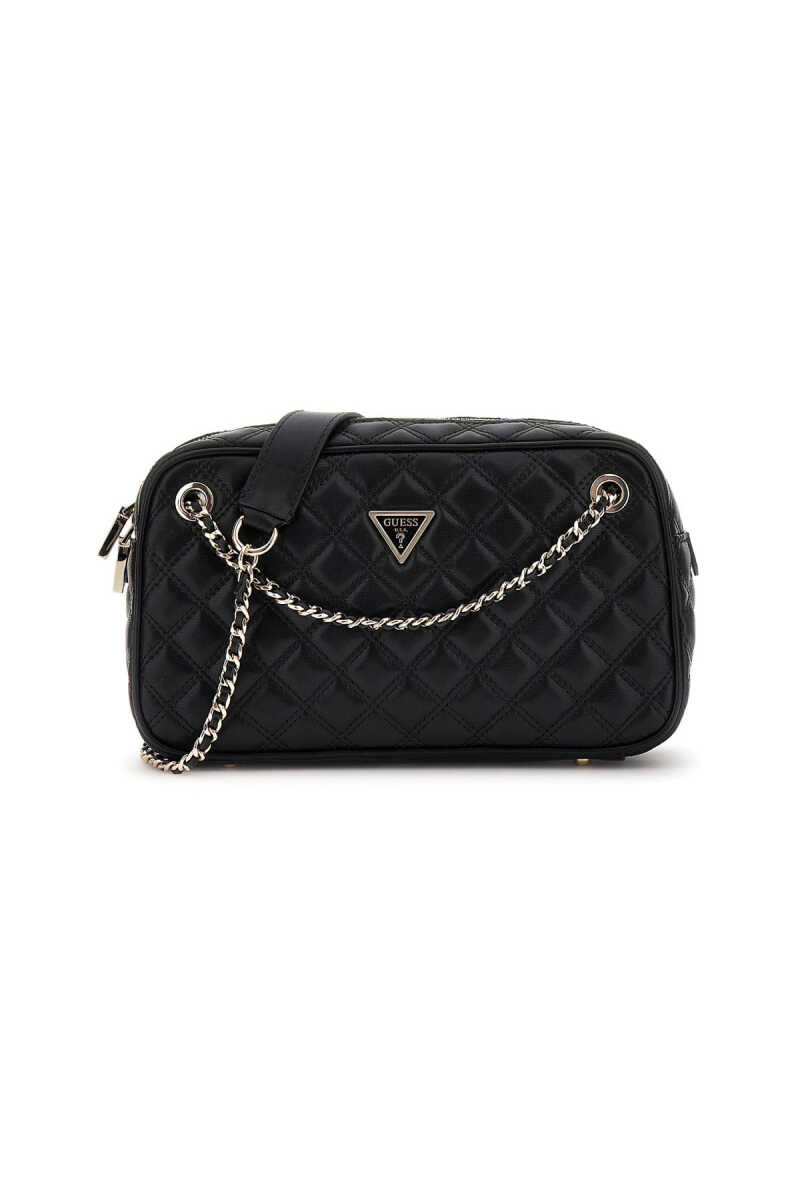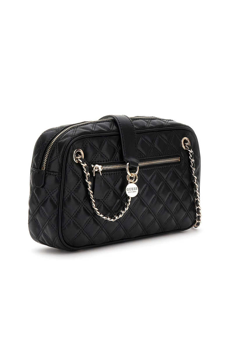 Yumuşak hatlara sahip, şık ve modern bir tasarıma sahip olan bu omuz çantası, tüm yüzeyini kaplayan kapitone deseniyle öne çıkar. Ön yüzünde yer alan dekoratif zincir detayı, çantanın klasik siyah rengiyle lüks bir kontrast oluşturur. Ön kısımdaki üçgen formlu metal aksesuar tasarıma imza atarken, arka yüzeydeki fermuarlı cep pratik bir kullanım sunar.