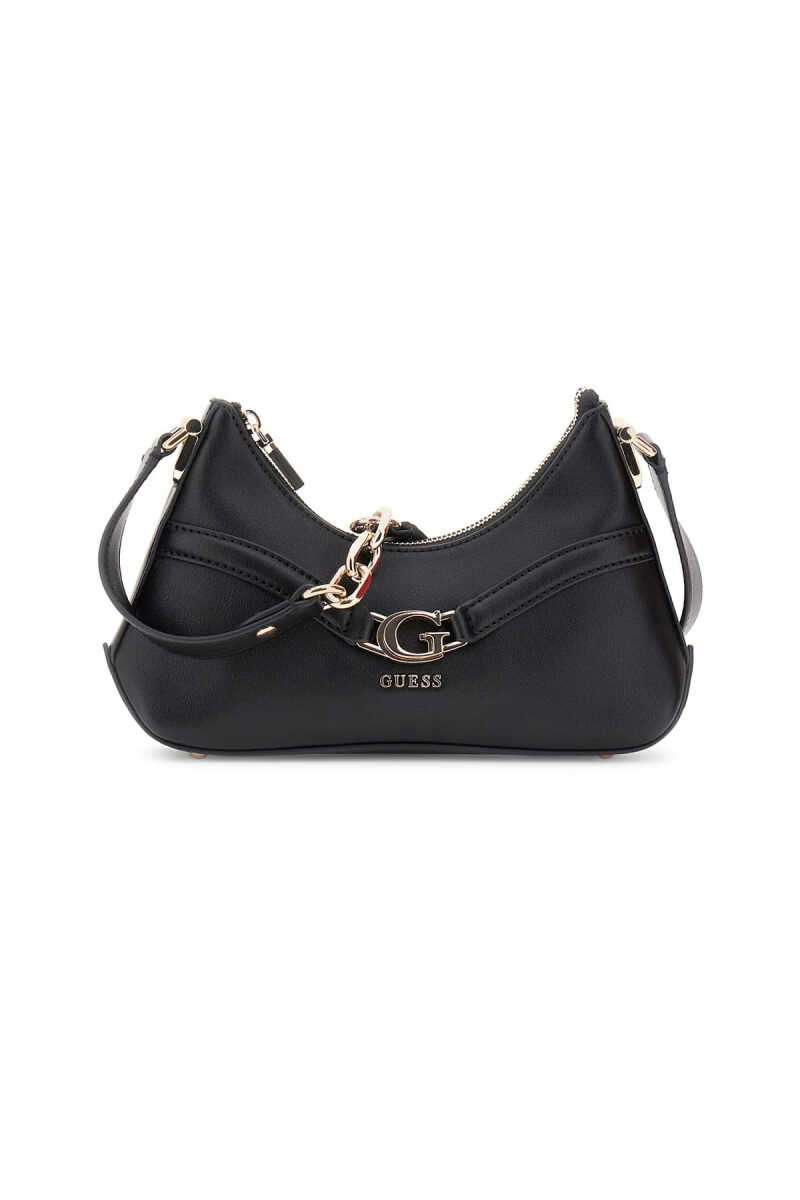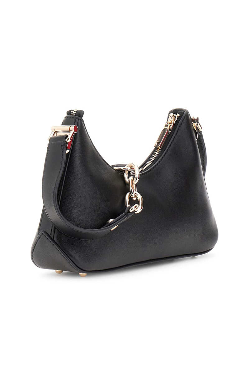 Modern ve popüler "hobo" formuna sahip bu omuz çantası, şehirli ve sofistike bir stil sunar. Pürüzsüz siyah yüzeyi, çantaya karakteristik bir kimlik kazandırır. Ön yüzeydeki kemer detayı, parlak metal harf logosu ve ona bağlı zincir aksesuarı, tasarıma dinamik bir dokunuş katar. Fermuarlı kapanışı, eşyalarınız için güvenli bir saklama alanı sağlar.